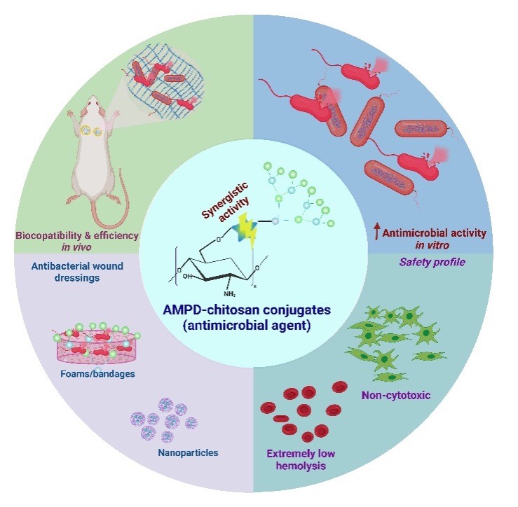 The AMPD-chitosan conjugates act synergistically to destroy bacteria, without any loss of antimicrobial activity. These new proprietary “active principles” were successfully incorporated into various biopolymer-based formulations, including nanoparticles, gels, and foams.