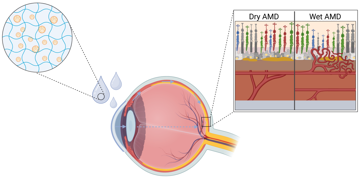 Retinal pathologies are diseases affecting the posterior segment of the eye, an area that is difficult to access for treatment. Intravitreal injection is the main route of administration, because it directly targets the area of interest. However, this highly invasive administration has rare but serious side effects and is a heavy burden for the patient, who often stops the treatment early. It is therefore essential to look at other less invasive ocular delivery routes. This project focuses on the development of different nanoparticles and polymeric solutions for topical application (eye drops). The selected raw materials, by promoting ocular absorption, increasing the residence time at the surface of the eye and solubilizing more API, allow to optimize ocular bioavailability and to reach the retina.